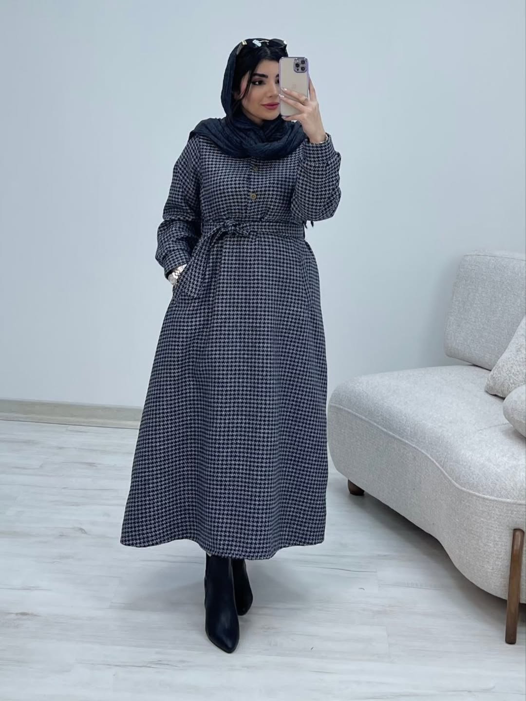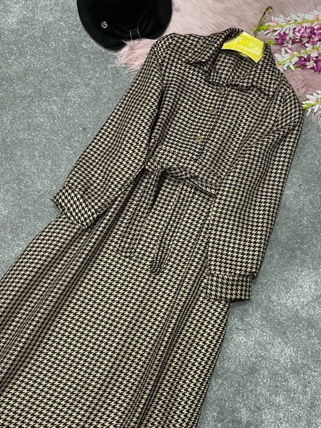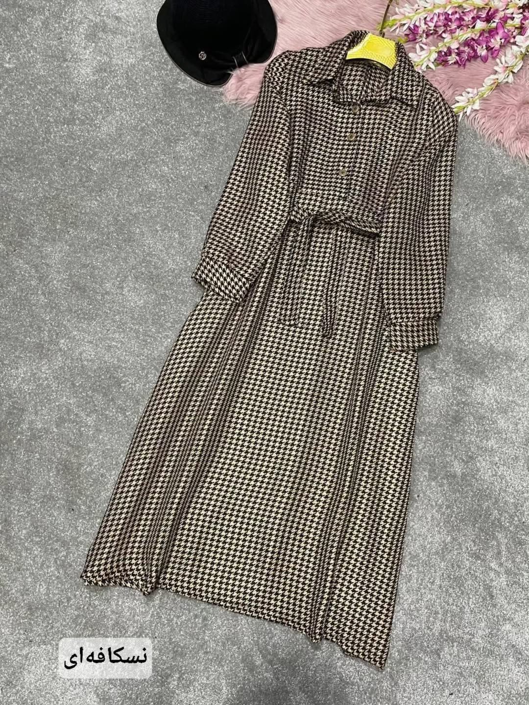 کفتان پاییزه پشمی با رنگ بندی سفیدمشکی، طوسی، کرم و نسکافهای. سایز فری ۳۸ تا ۴۶ با قد کار حدودا ۱۳۰ سانت، قد آستین ۵۸ سانت، دور بازو ۴۲ سانت و دور سینه ۱۱۰ سانت. دارای دکمه های جلوی سینه، کمربند جهت تنظیم سایز و جیب کاربردی.