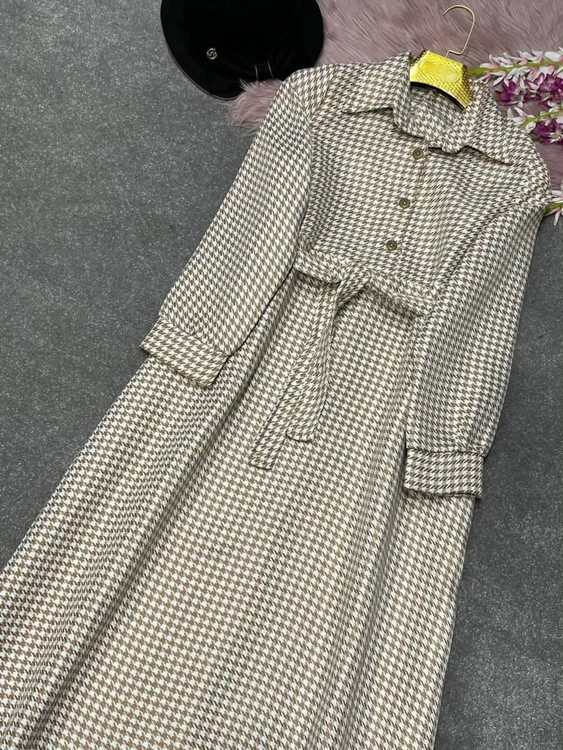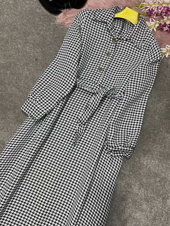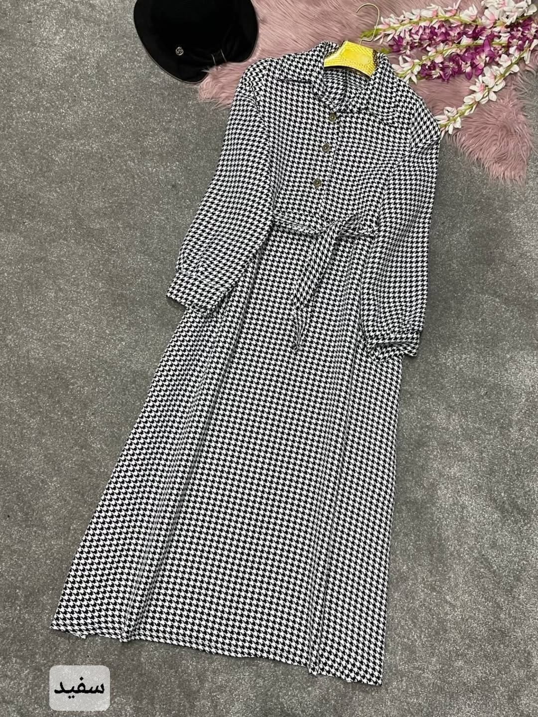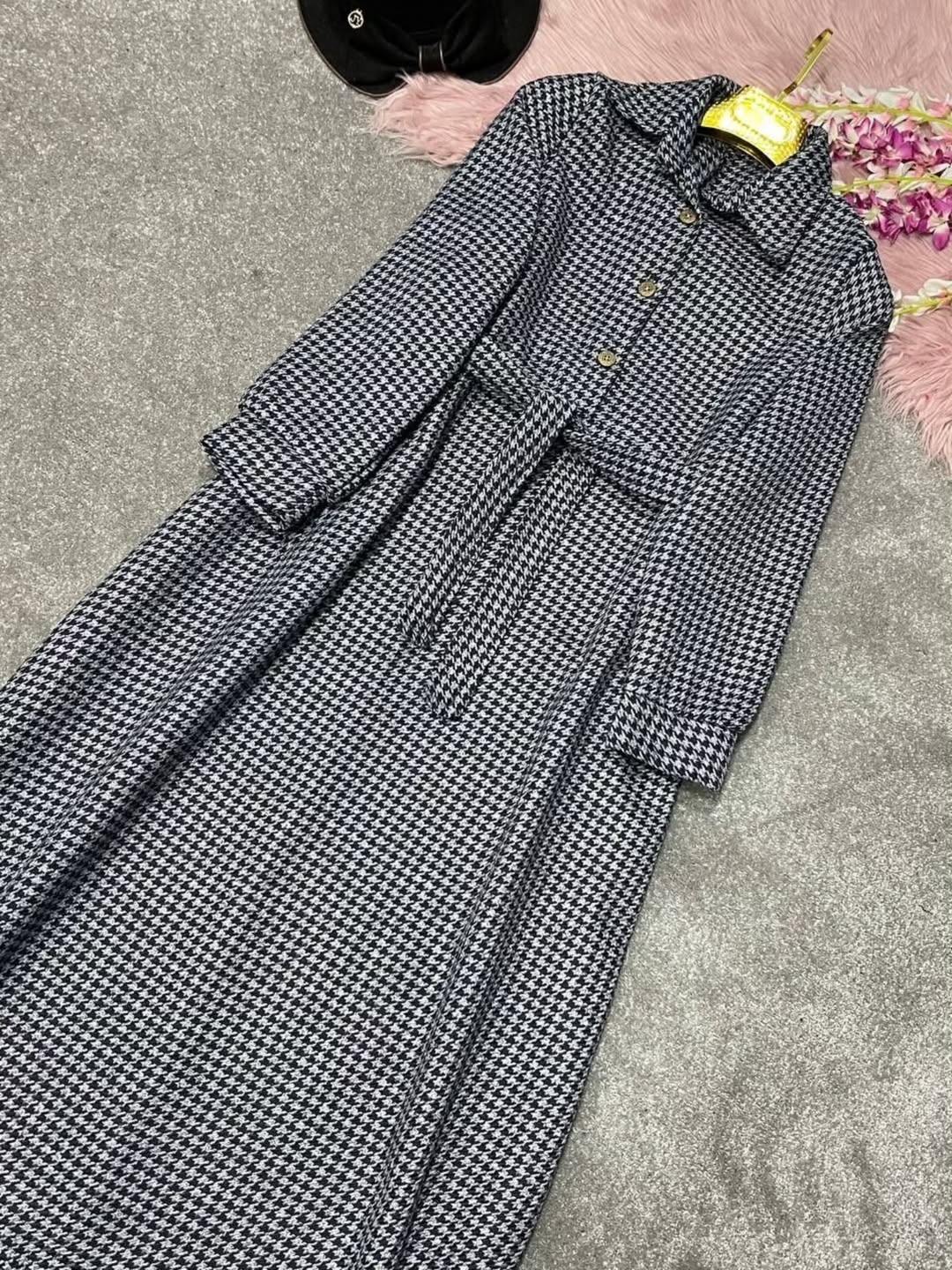 کفتان پاییزه پشمی با رنگ بندی سفیدمشکی، طوسی، کرم و نسکافهای. سایز فری ۳۸ تا ۴۶ با قد کار حدودا ۱۳۰ سانت، قد آستین ۵۸ سانت، دور بازو ۴۲ سانت و دور سینه ۱۱۰ سانت. دارای دکمه های جلوی سینه، کمربند جهت تنظیم سایز و جیب کاربردی.